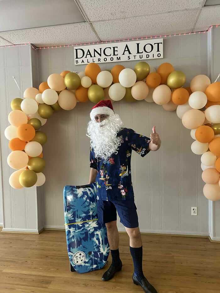 The next challenge? Convincing Georgi to play Surfing Santa — complete with “swimming” across the floor on a rolling dolly. Shockingly, he agreed in under 60 seconds. (I’m convinced he secretly loved the idea.) His very talented wife Adriana and the five-time World Showdance Champion, Mr. Max Kozhevnikov, eventually joined the madness and helped bring our off-the-wall choreography to life.